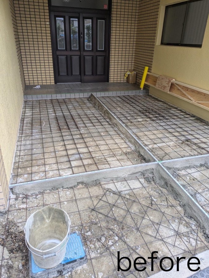 施工前はタイル張りの土間でひび割れがあり、勾配が悪く雨水がたまっていましたが、再度勾配をつけ、ひび割れ防止の為に伸縮目地を入れて生コン打ちシンプルに仕上げました。雨水が溜まるのが解消されました。